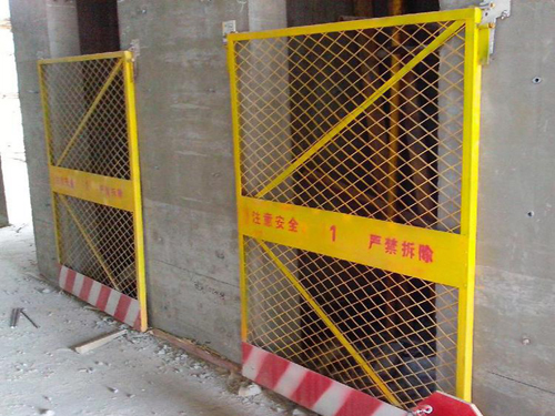 電梯井口防護門全部由鋼結構組成。鋼材采用國家標準材料,制作嚴格按圖施工,尺寸正確,焊接點牢固,達到安全防護之目的,電梯安全門采用檸檬黃色,門下部檔架板采用黃、黑間隔。電梯井口防護門是建筑施工現(xiàn)場預防人身傷害必備的防護設施,它適用于各類建筑施工工地。